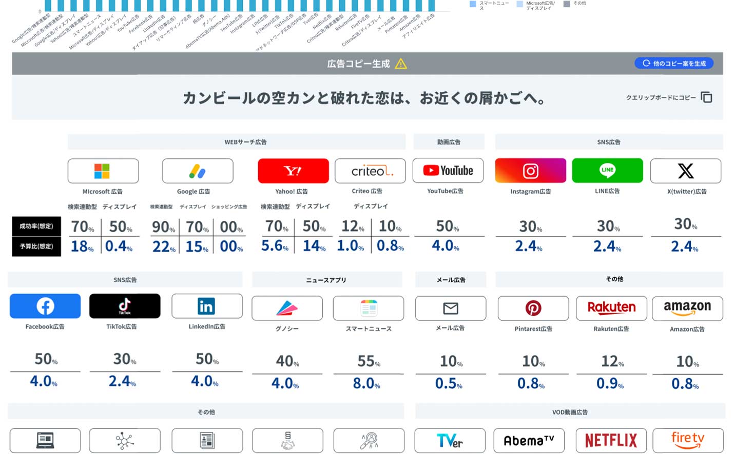 成功率と予算配分を表示するので、あなたが気付かなかった媒体で期待以上の効果も…